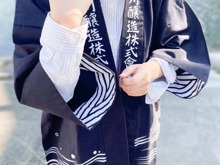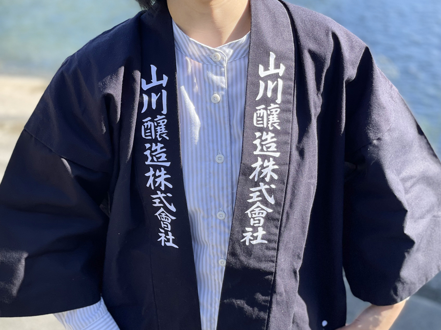 袖の裏側には木桶の箍(たが)、表側の襟には山川醸造株式会社の社名が入っています。